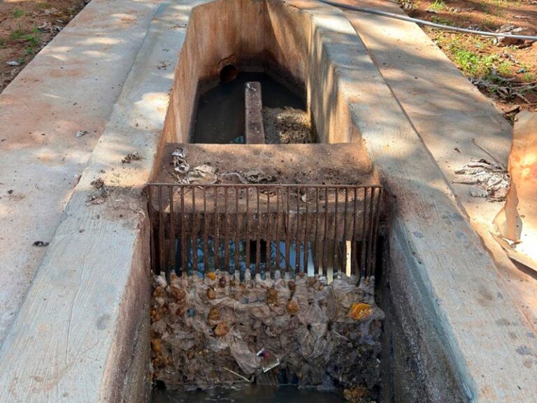 Passagem do efluente obstruída. Todos os dias é necessário limpar a grade, tamanha a quantidade de dejetos sólidos descartados indevidamente no vaso sanitário (Foto: RIC Ambiental)