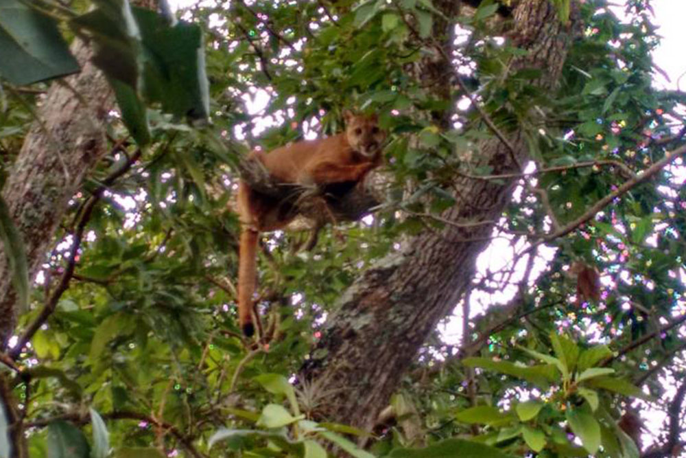 Animal foi encontrado em cima de abacateiro após ser acuado por cães; felino fugiu antes de ser retirado por biólogos e veterinários.