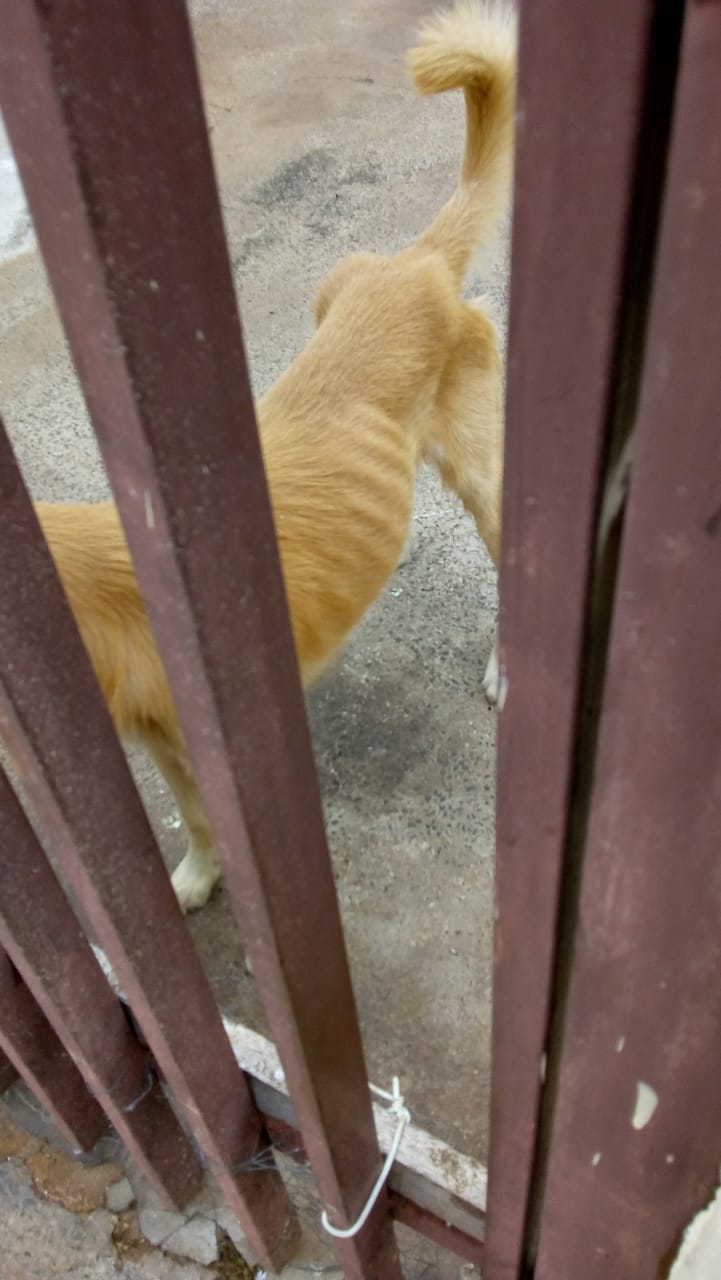 Foi constatado que o cão estava magro, um pouco debilitado, sem água, sem comida, e sem os devidos cuidados que o animal necessita.