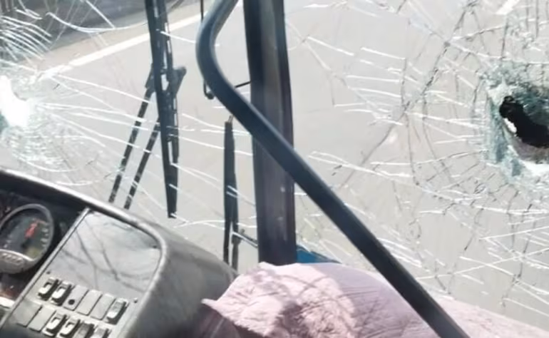 Torcedores do Santos atiraram pedras em direção ao ônibus. Imagens divulgadas nas redes sociais mostram vidros do veículo trincados.