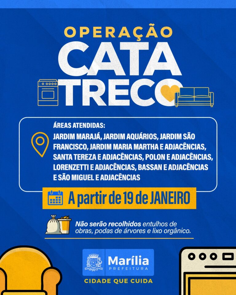 A Prefeitura de Marília inicia na segunda-feira (19) uma nova etapa da Operação Cata Treco em nove bairros da zona oeste da cidade. Segundo a Secretaria Municipal do Meio Ambiente e Serviços Públicos, a ação será realizada das 8h às 16h nos bairros Marajá, Aquarius, São Francisco, Maria Martha, Santa Tereza, Polon, Lorenzetti, Bassan e São Miguel.
