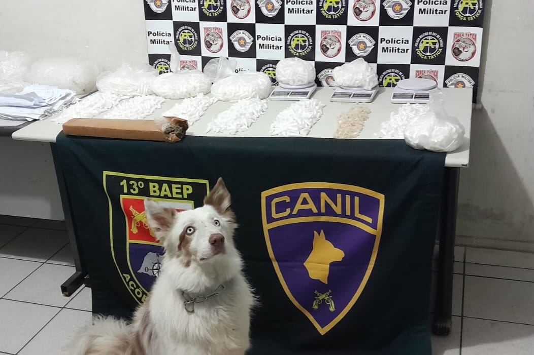Com o auxílio do cão Bruce, os policiais conseguiram localizar em uma área de mata próxima um saco preto com 3,1 mil microtubos com cocaína, com peso superior a sete quilos. Havia ainda um tijolo de maconha de 1,2 quilo.
