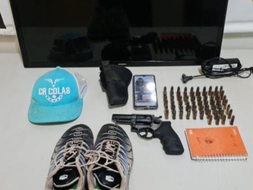 Durante a abordagem, um dos suspeitos admitiu manter uma arma de fogo em sua residência, segundo a PM. No local, os policiais apreenderam um revólver calibre .38, carregado com seis munições, além de 58 projéteis extras do mesmo calibre.