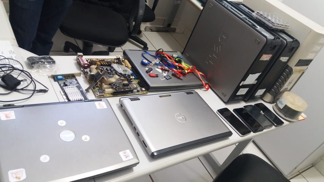 Foram apreendidos diversos pen drives e cartões de memória e pelo menos três CPUs e três notebooks, além de celulares, CDs e DVDs.