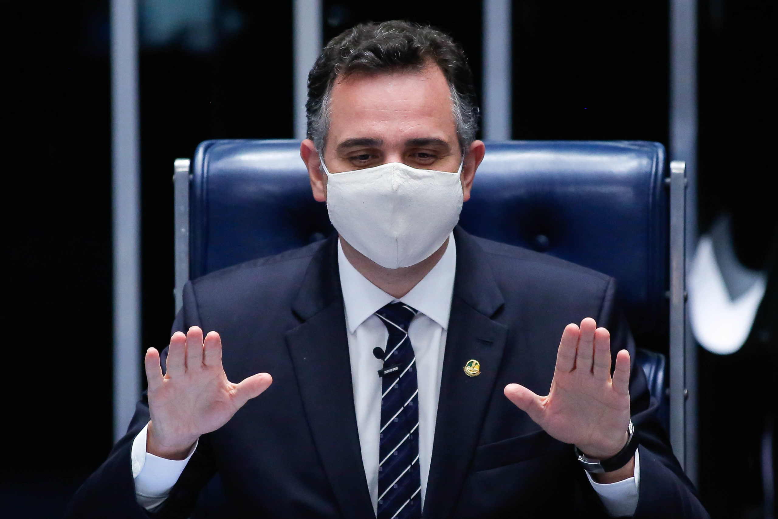 O presidente do Senado, Rodrigo Pacheco, durante sessão de debates temáticos com a presença do ministro da Saúde, Eduardo Pazuello na sessão remota semipresencial . Sérgio Lima/Poder360 11.02.2021