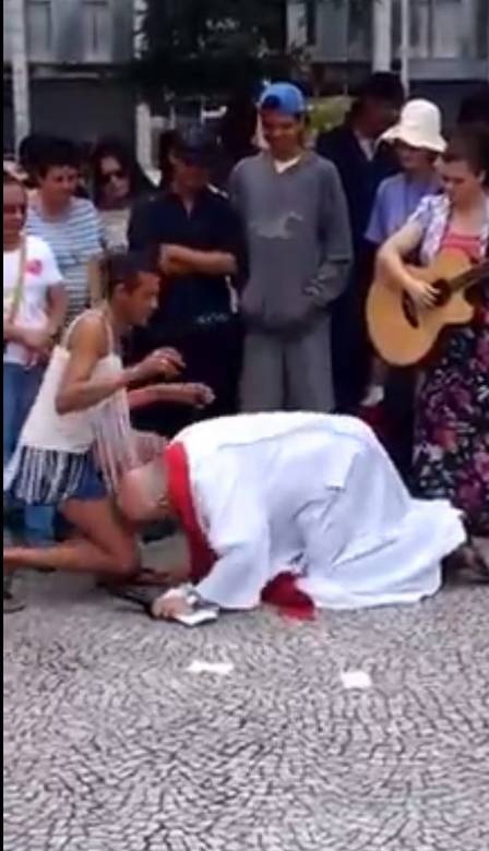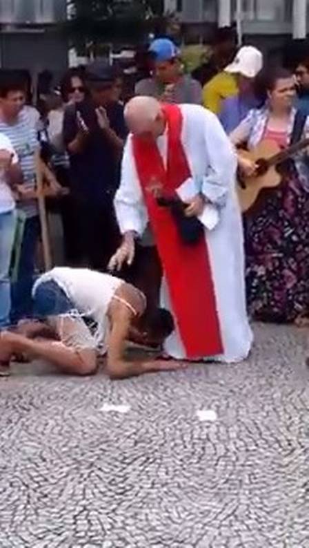 Depois do gesto do padre, ovacionado por um grupo que acompanhava o evento, Scheila também bate palmas e repete o gesto do religioso, beijando seus pés.