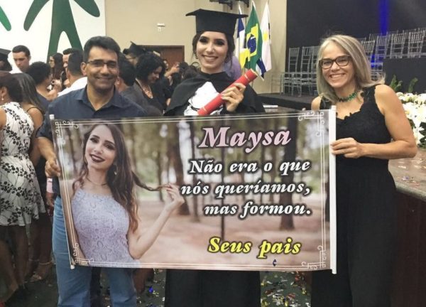 A jovem Maysa Ferreira, de Palmas (TO), se graduou em jornalismo e sua colação de grau ocorreu no último sábado, 19, onde contou com o carinho de amigos, familiares e… uma ‘homenagem’ bastante divertida dos pais, que levaram uma faixa com os dizeres “não era o que nós queríamos, mas formou”.