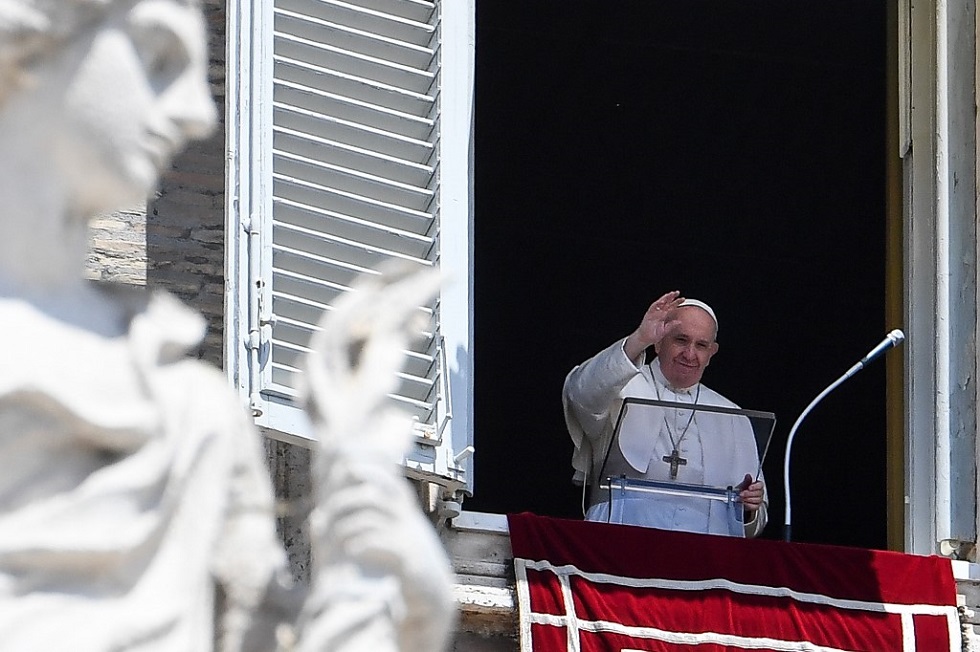 Pope Francis waves to the crowd from the window of the apostolic palace overlooking St Peter's square during the Sunday Angelus prayer, on June 7, 2020, in the Vatican. (Photo by Andreas SOLARO / AFP)