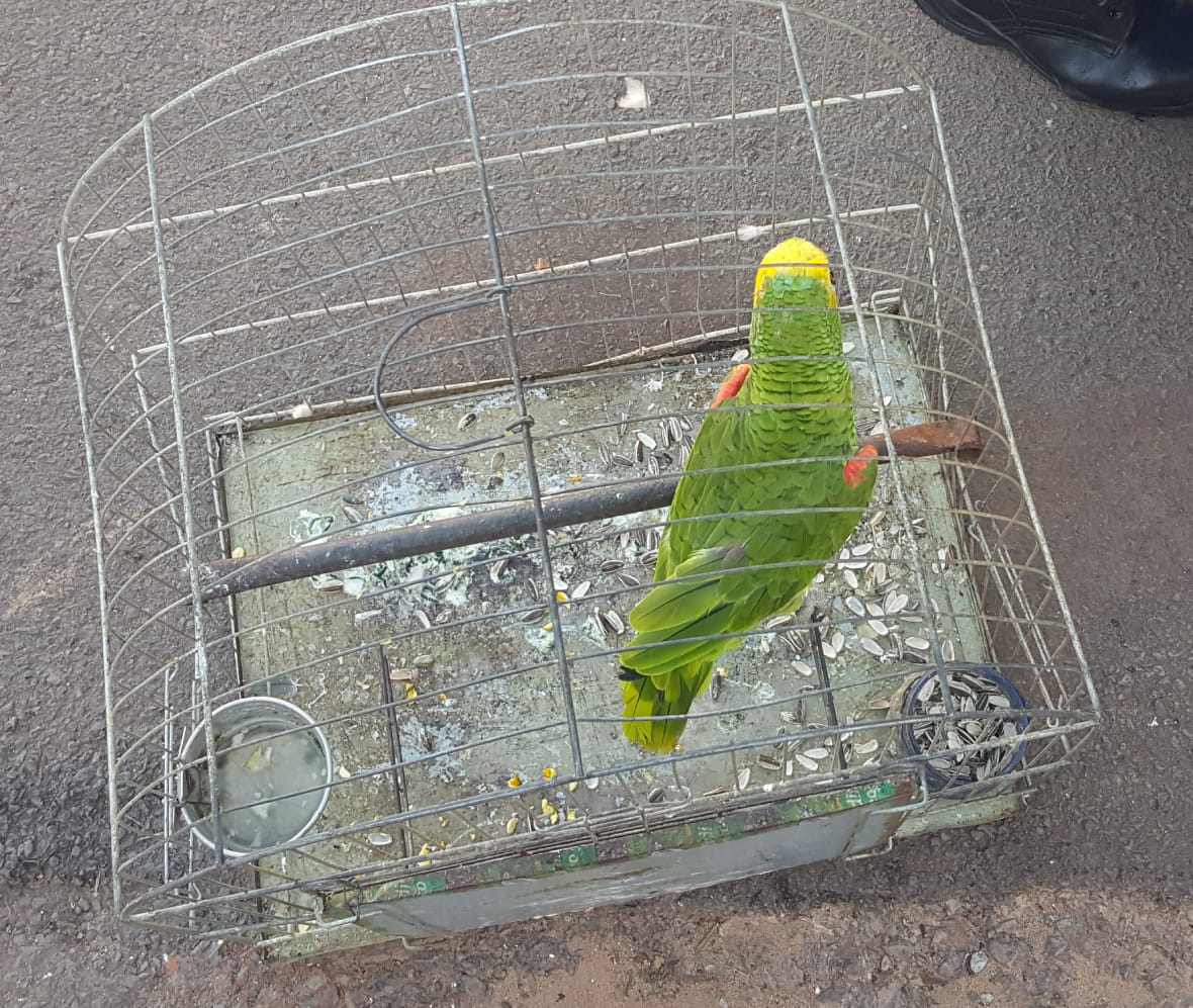 Após denúncia sobre pássaros em cativeiro a equipe operacional se deslocou até o local onde foi constatado no quintal de uma residência um papagaio verdadeiro (Amazona Aestiva) em cativeiro.