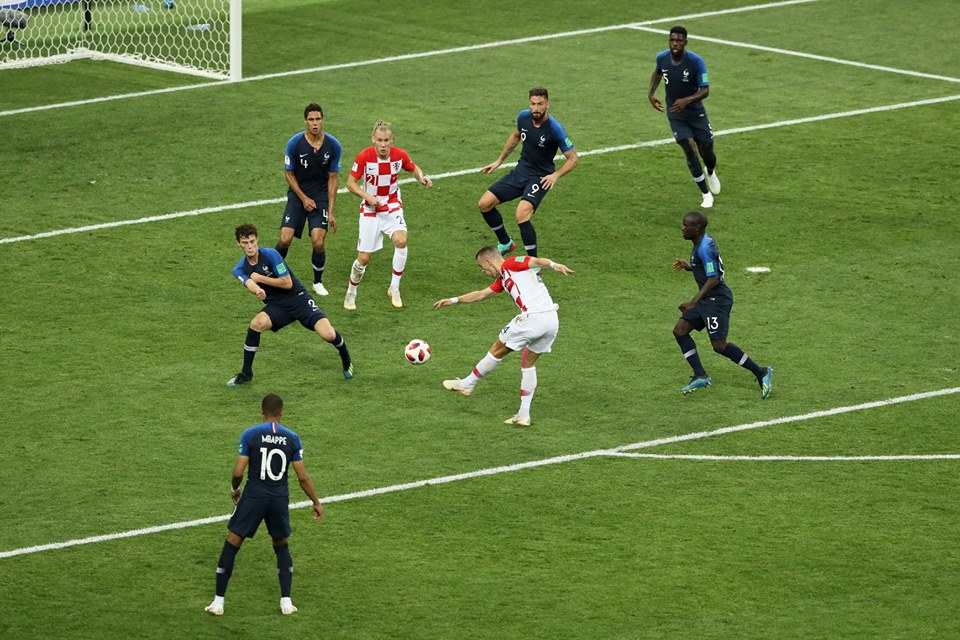 Mesmo em uma final recheada de alternativas técnicas e táticas, os erros também apareceram. Erros grotescos. O goleiro Lloris tentou driblar o atacante Mandzukic e perdeu a bola na pequena área. Gol da Croácia: 4 a 2. Foi provavelmente a única grande falha defensiva da França na Copa.