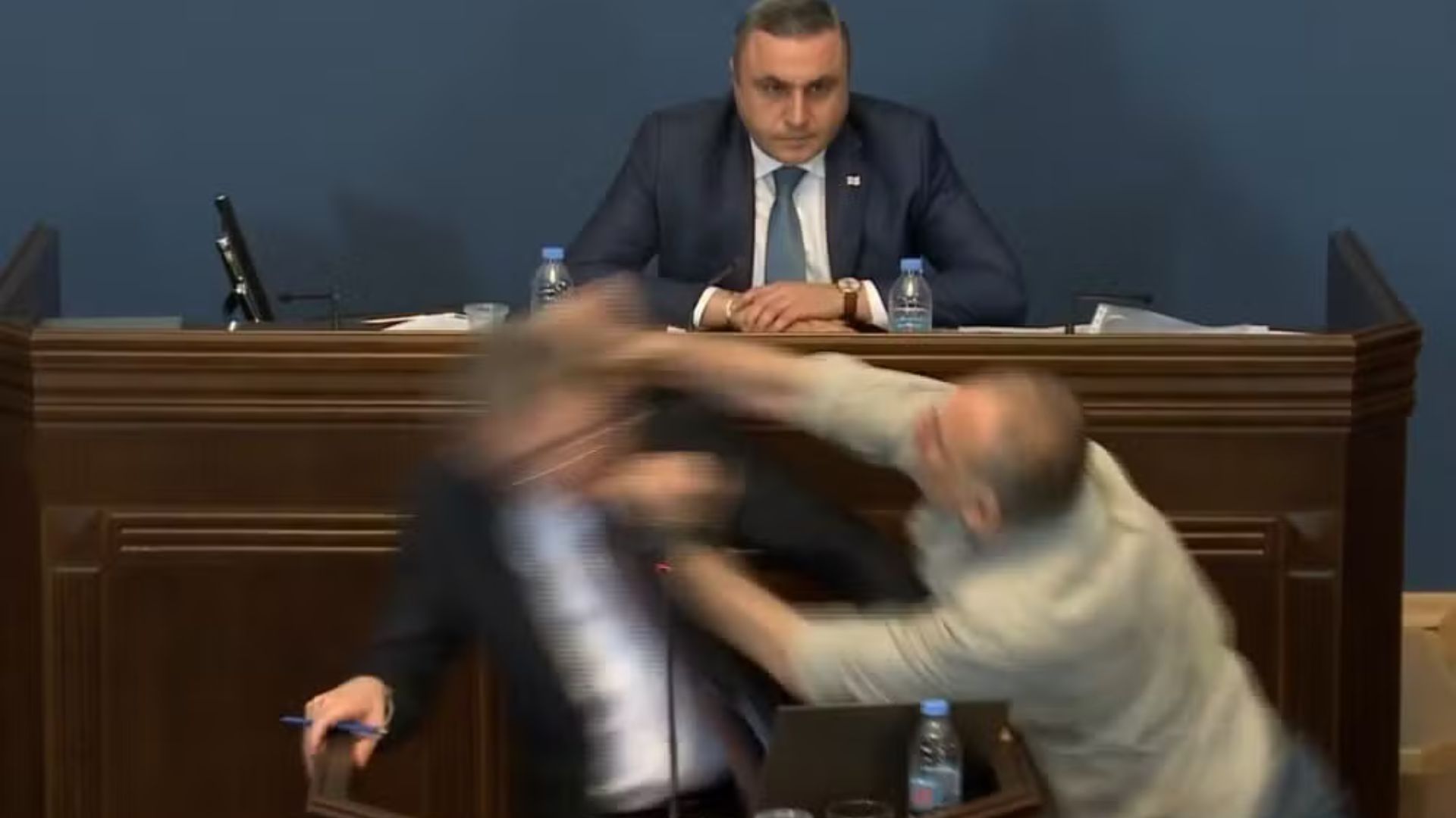 Imagens divulgadas pela Casa mostram o momento em que o deputado Aleko Elisashvili, do Partido dos Cidadãos, da oposição, ataca o parlamentar da base governista Mamuka Mdinardze, do Sonho Georgiano, com um soco na cabeça. Em seguida, outros políticos se levantam e se envolvem na briga.
