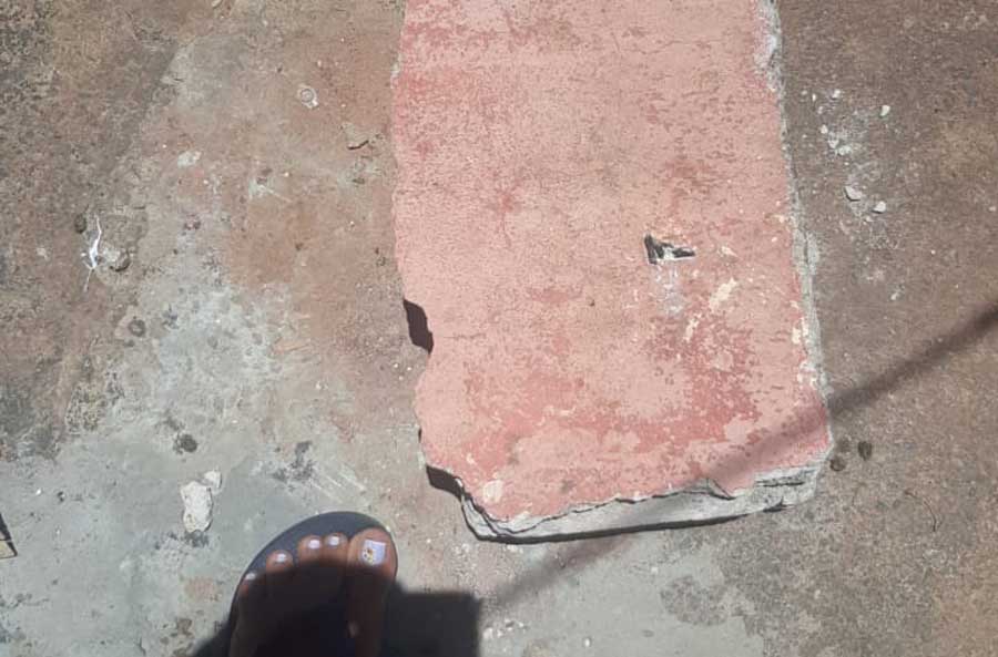 “Agora começou a cair mesmo”, alerta Renata. “Foi uma parte grande do concreto da parede que tampa a caixa d’água e uma outra parte um pouco menor”, conta Silva.