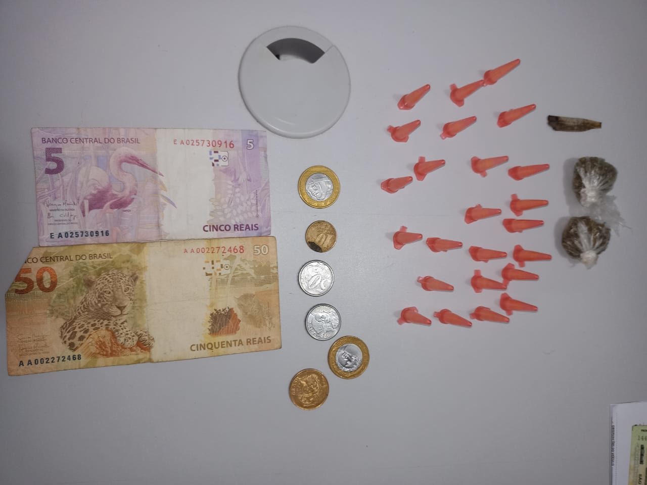 Os policiais fizeram a abordagem do veículo e nada de ilícito foi encontrado no carro, porém com um dos passageiros havia 24 pinos com cocaína, duas porções de maconha e R$ 58,35. Com os outros dois passageiros e o motorista nada foi localizado.