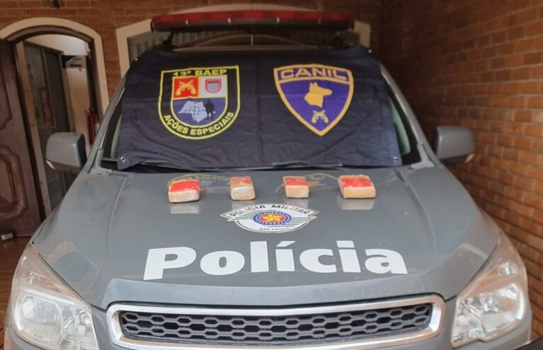 Quatro tabletes de maconha, com um total de quase 900 gramas da droga, foram localizados na tarde desta quinta-feira (5) pelos cães de faro da Polícia Militar, em Santa Cruz do Rio Pardo. A droga estava escondida em um veículo apreendido em um pátio permissionário do Departamento de Trânsito de São Paulo (Dentran-SP).