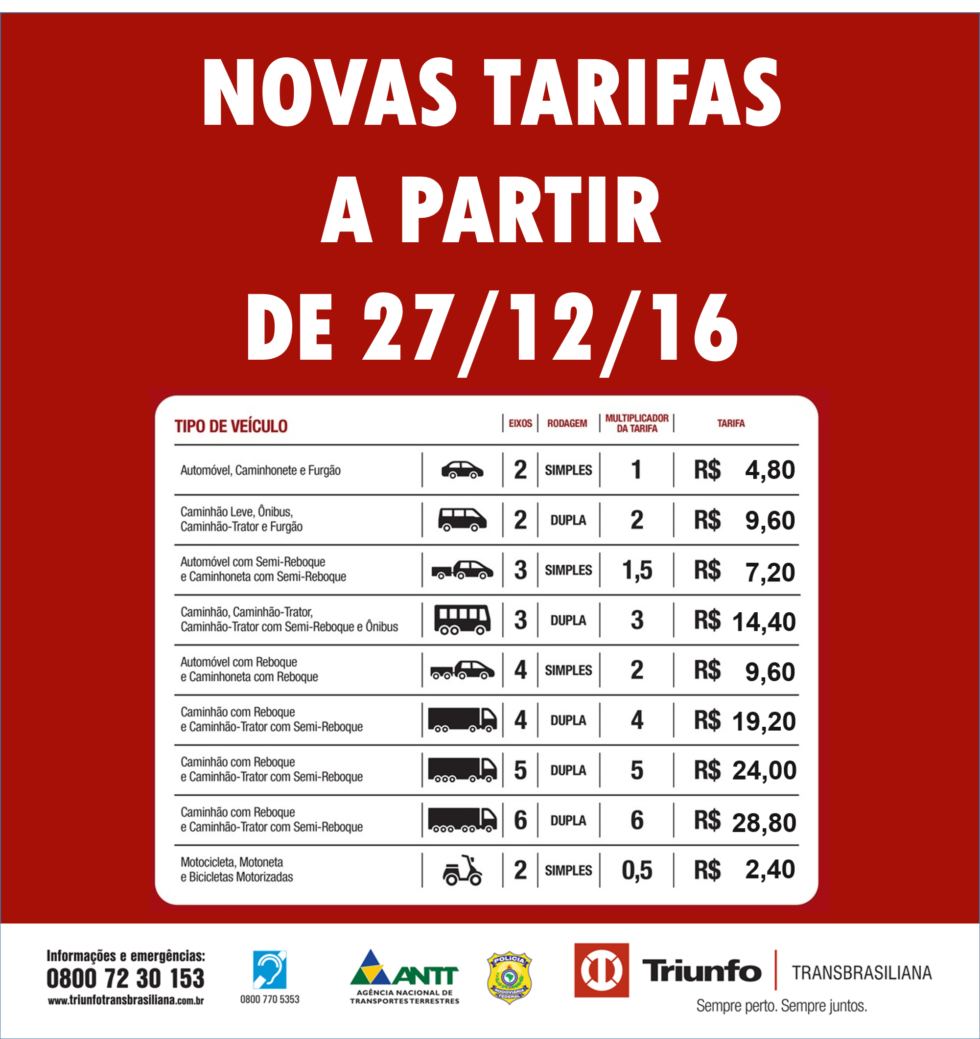 A nova tarifa passa a valer nas quatro praças de pedágio da Transbrasiliana (inclusive a de Marília) a partir da meia-noite de terça-feira, dia 27 de dezembro.