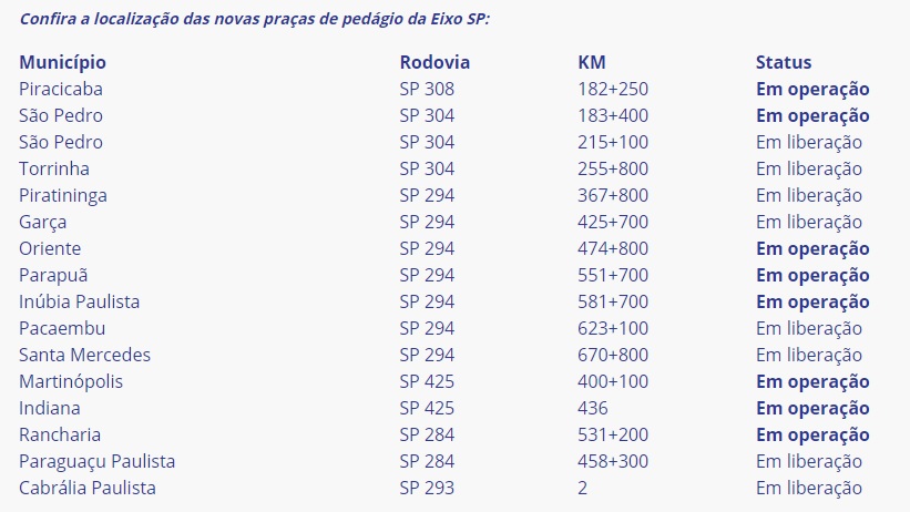 Conforme deliberação da Secretaria de Transportes, a operação é iniciada nas praças da Rodovia Assis Chateaubriand (SP-425), km 436, em Indiana; da Homero Severo Lins (SP-284), km 531+200, em Rancharia; e da Comandante João Ribeiro de Barros (SP-294), km 474+800, em Oriente. Na Rodovia Hermínio Petrin (SP-308), começa a funcionar a praça no km 182+250, em Piracicaba; e na Geraldo de Barros (SP-304), no km 183+400, em São Pedro.