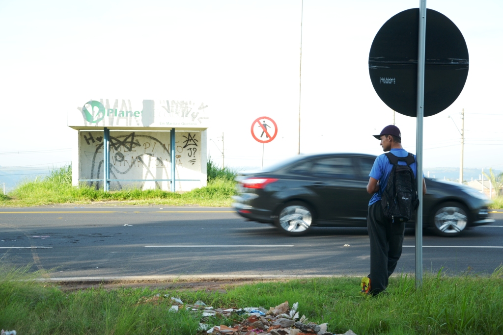Morador espera “melhor momento” para travessia proibida até o ponto de ônibus do outro lado da SP-294 no distrito de Nóbrega (Foto: Leonardo Moreno)