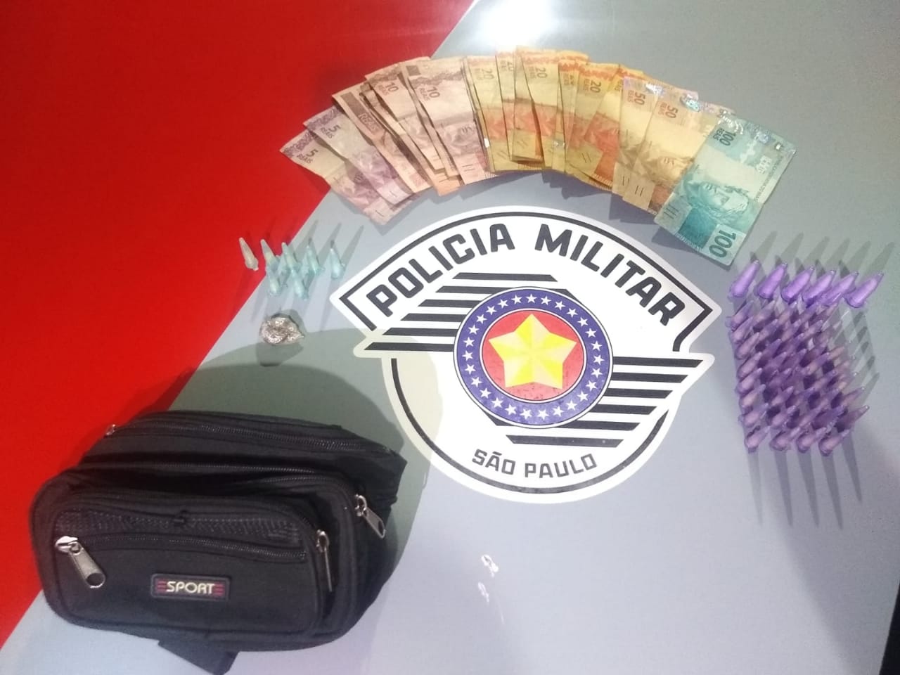 Com o apoio do Canil foi localizada uma pochete com 46 pinos com crack, seis pinos com cocaína e R$ 600. Também foi encontrada uma porção de maconha que estava em um cinzeiro no quarto.