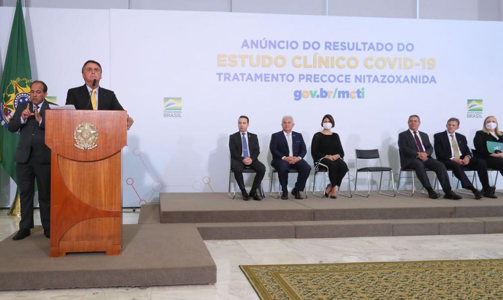 O estudo clínico do Laboratório Nacional de Biociências sobre o uso do medicamento nitazoxanida em pacientes na fase precoce da covid-19 demonstrou eficácia no tratamento da doença, reduzindo a carga viral das pessoas infectadas. O anúncio ocorreu durante cerimônia no Palácio do Planalto, na tarde desta segunda-feira (19), com a participação do presidente Jair Bolsonaro.