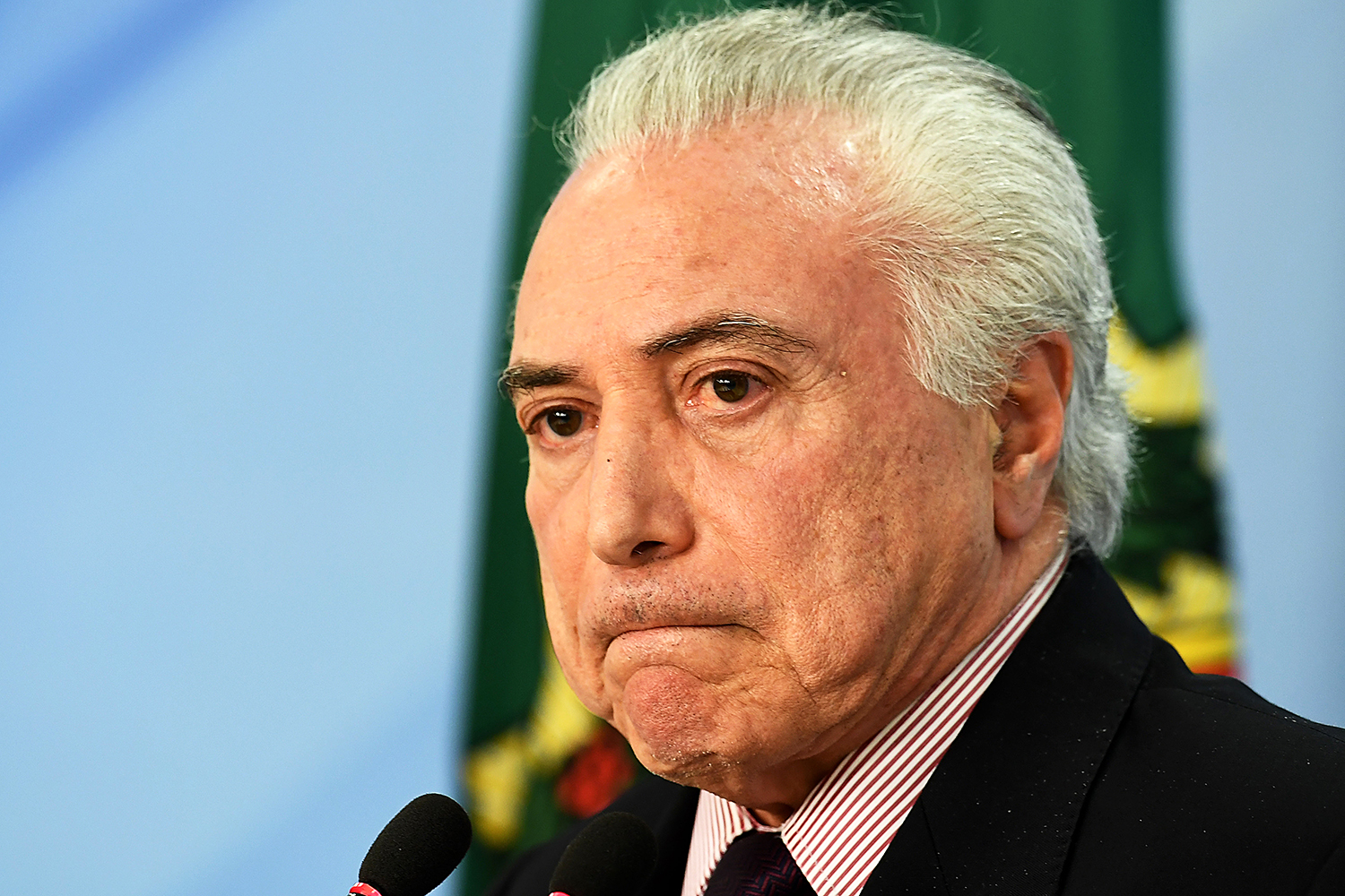 President Michel Temer makes a statement at Planalto Palace to announce Ivan Monteiro as Petrobras' new president, in Brasilia on June 1, 2018. Monteiro replaces Pedro Parente who resigned this morning. / AFP PHOTO / EVARISTO SA