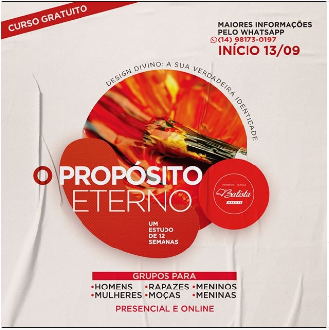 Ainda estão disponíveis vagas para o curso “Design Divino: a Sua Verdadeira Identidade”, promovido pela Primeira Igreja Batista de Marília (PIB). Trata-se de um instrumento poderoso, inédito em Marília, que aborda a masculinidade e a feminilidade à luz das Escrituras.