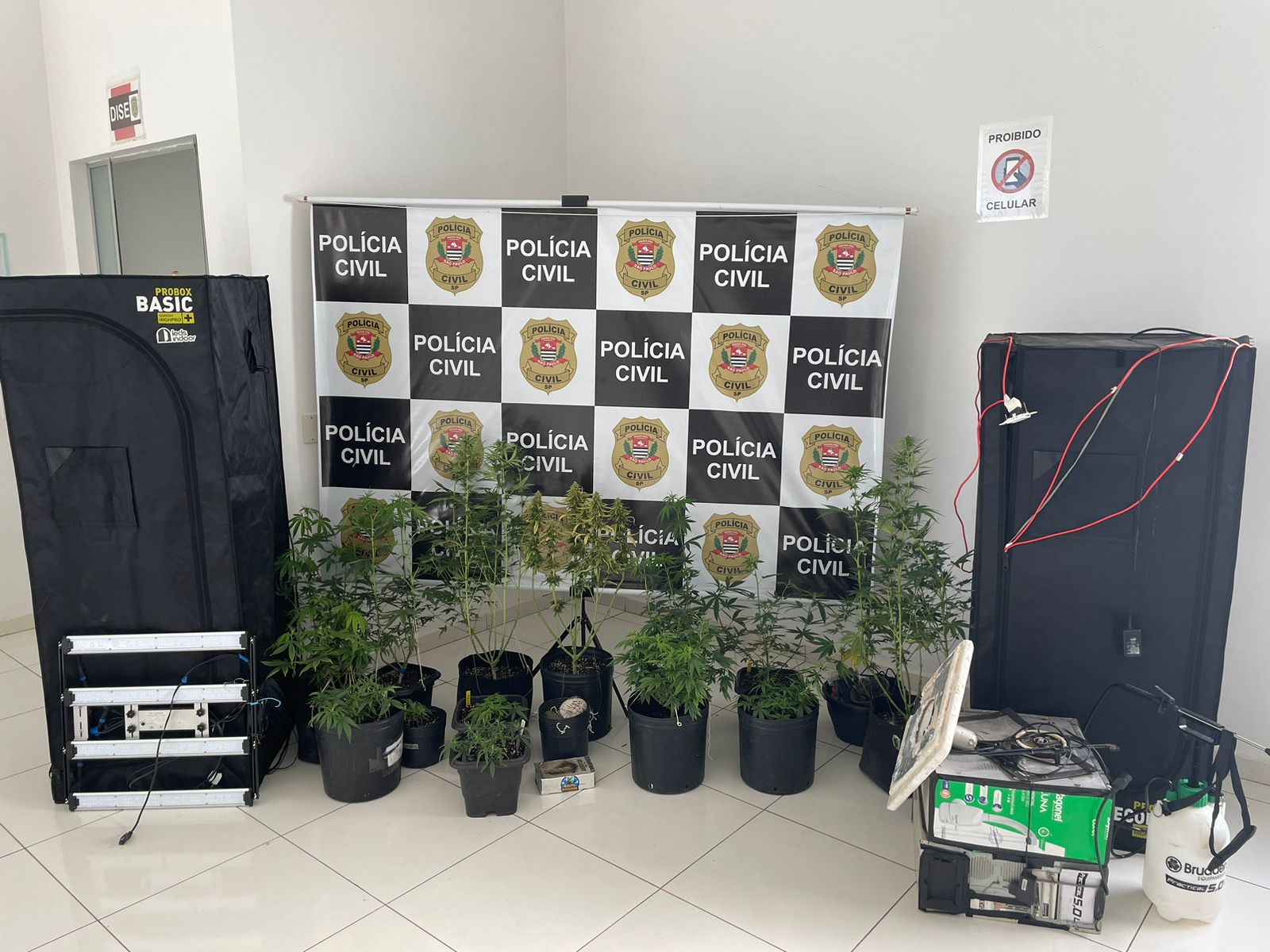 No imóvel havia três barracas utilizadas como estufas, equipadas com iluminação de LED, timer eletrônico, exaustores, ventilação artificial, substratos, além de outros materiais para o cultivo da droga.