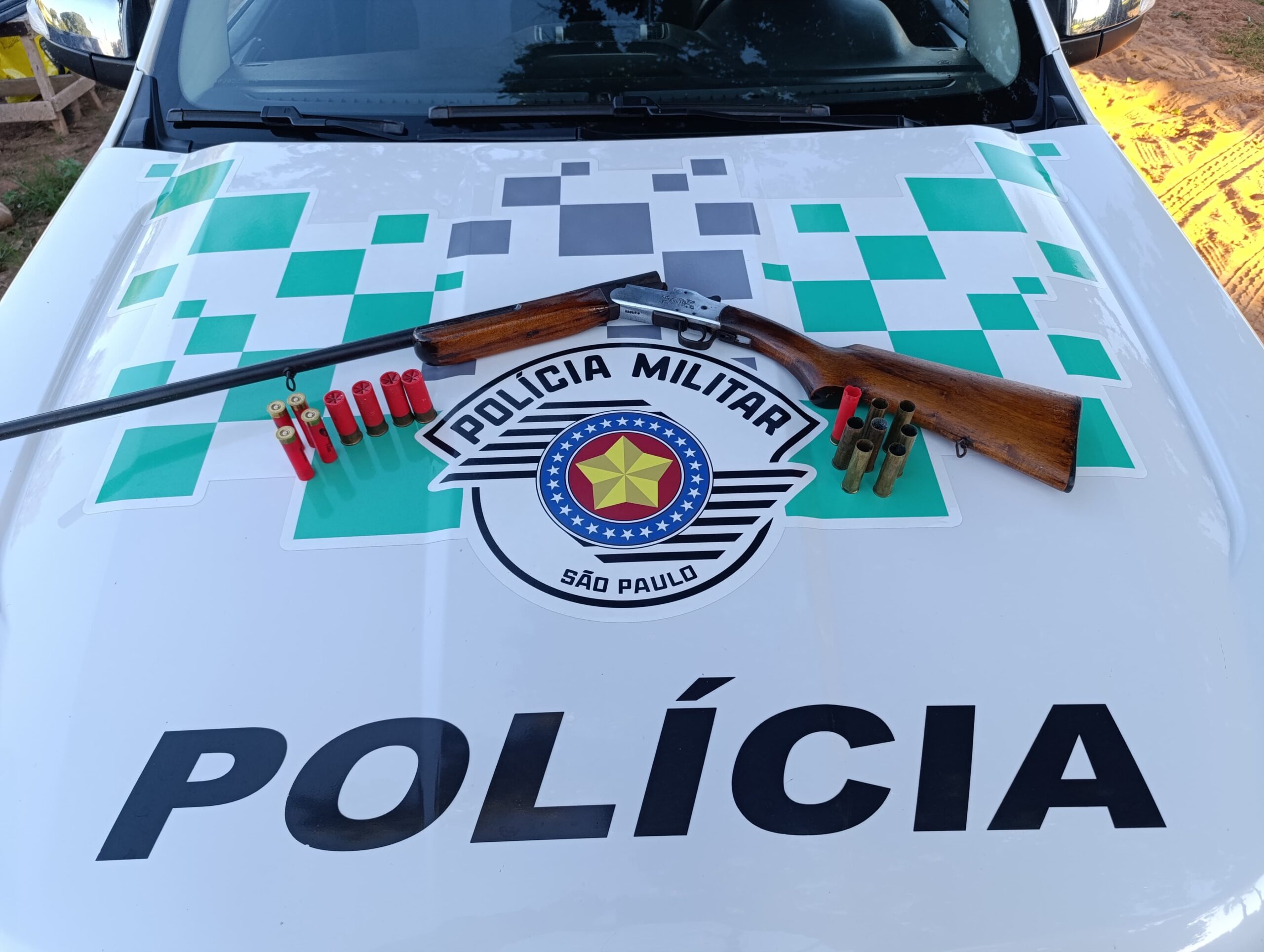 Durante a conversa, o morador confirmou possuir uma espingarda guardada em casa e indicou onde a arma estava. Ele apresentou aos policiais uma espingarda calibre 28, da marca Boito, além de munições.