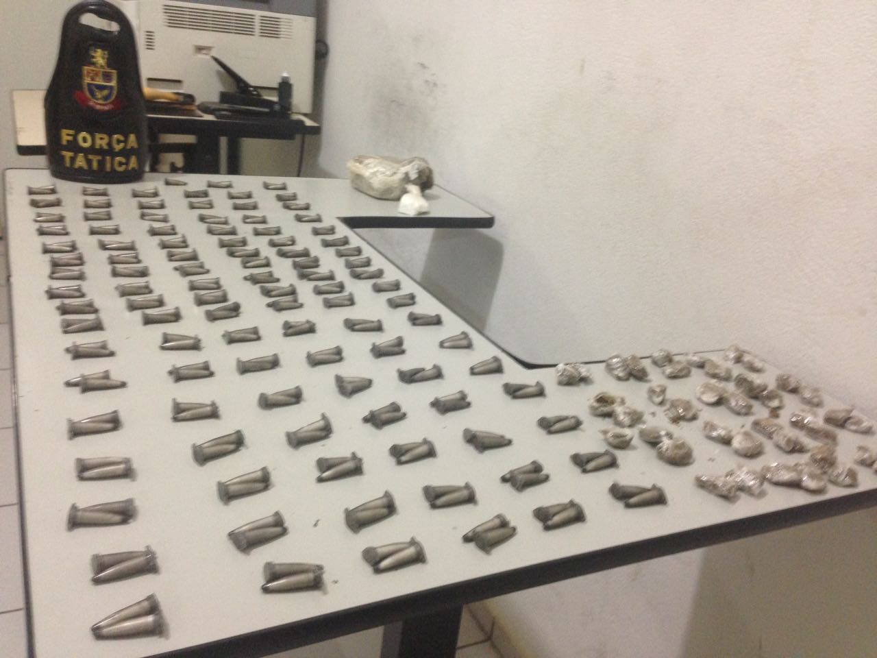 Durante vistoria na mochila do rapaz foram localizados aproximadamente 209 pinos de cocaína, 41 porções de maconha e meio tijolo.