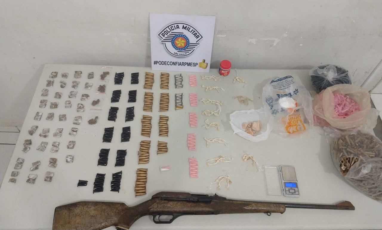 Uma porção maior de cocaína, pesando 57 gramas, e outra de crack, com 50 gramas, também foram localizadas, além de uma balança de precisão e um rifle de origem alemã.
