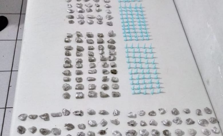 Os homens não foram localizados, porém foram realizadas buscas com o cão farejador e aos fundos da rua Jácomo Bertolini os militares encontraram um saco preto enterrado com 230 porções de maconha e 157 pinos de cocaína.