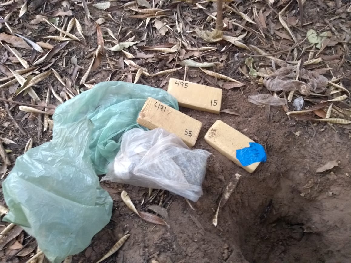 Os militares realizaram incursão na área da mata através de uma trilha, porém ninguém foi localizado. A PM notou que havia uma área de terra mexida e após vistoria encontraram uma sacola com quatro tijolos de maconha.