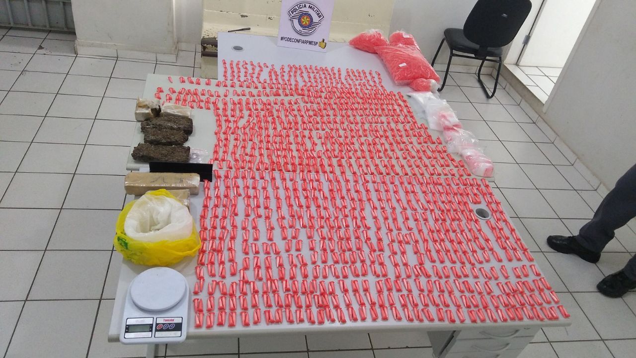 Segundo a PM, foram apreendidos três quilos de maconha, 250 gramas de pasta base de cocaína, cerca de dois mil pinos com o pó branco, além de porções prontas de maconha, balança de precisão, e centenas de pinos vazios que acondicionariam mais drogas.