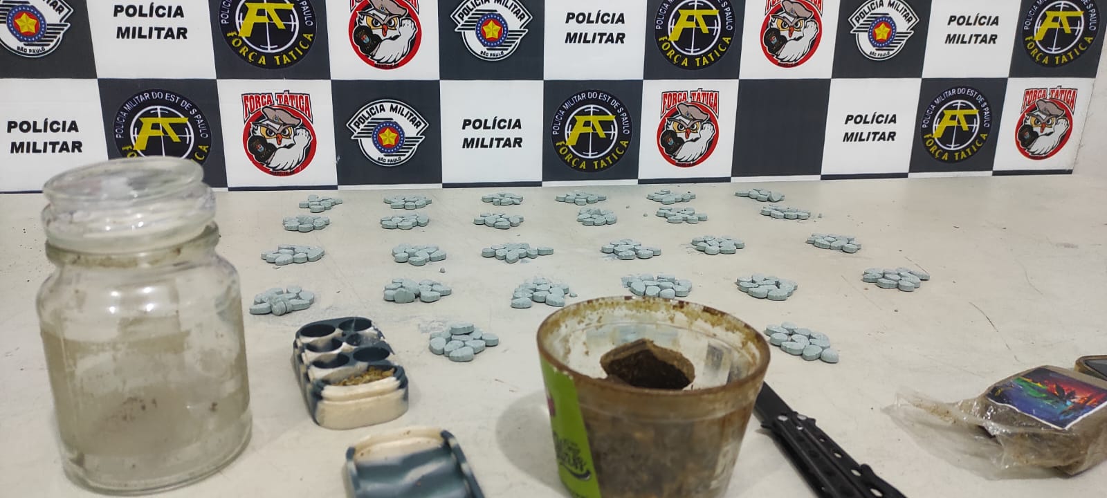 Com o homem havia uma porção grande de substância parecida com maconha. A equipe policial entrou no local e acabou encontrando 20 comprimidos de substância semelhante a ecstasy. No carro do indivíduo havia mais 250 comprimidos iguais e várias porções de maconha.