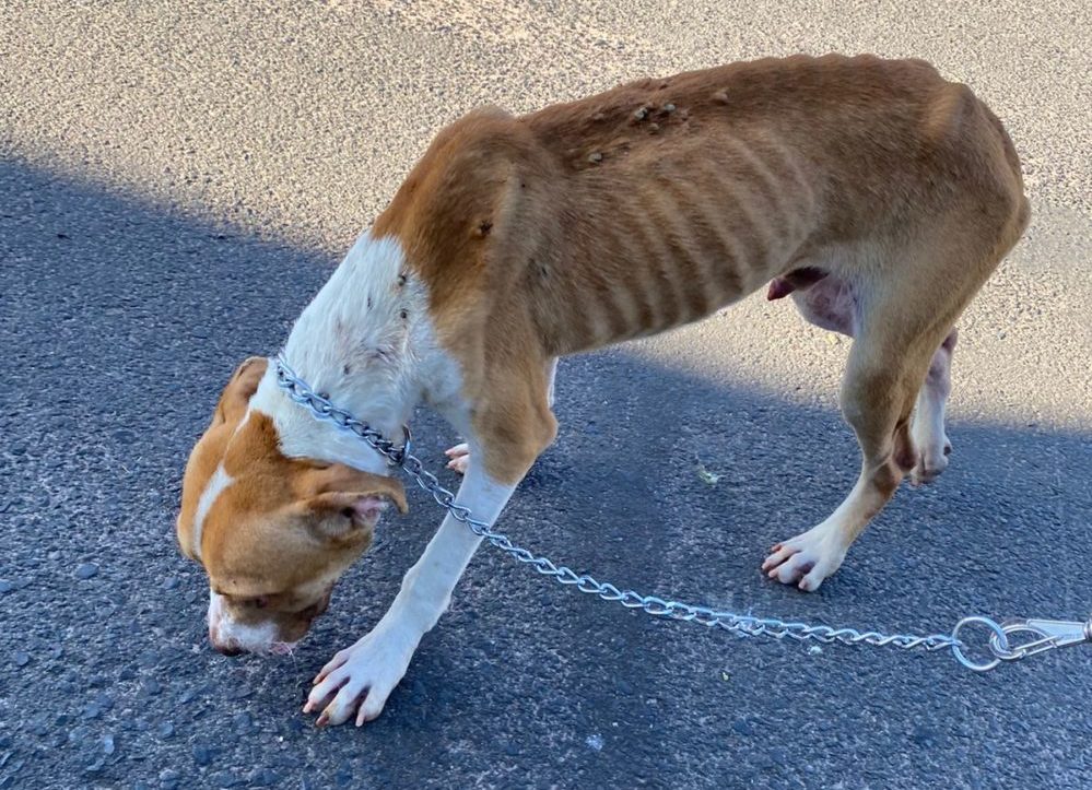 Uma viatura foi até o endereço e constatou a existência de um cachorro da raça pitbull caquético, sem alimentação e água. Também foi observada uma cadela em estado caquético, junto com aos quatro filhotes, todos sem comida e água.