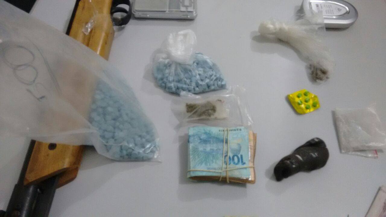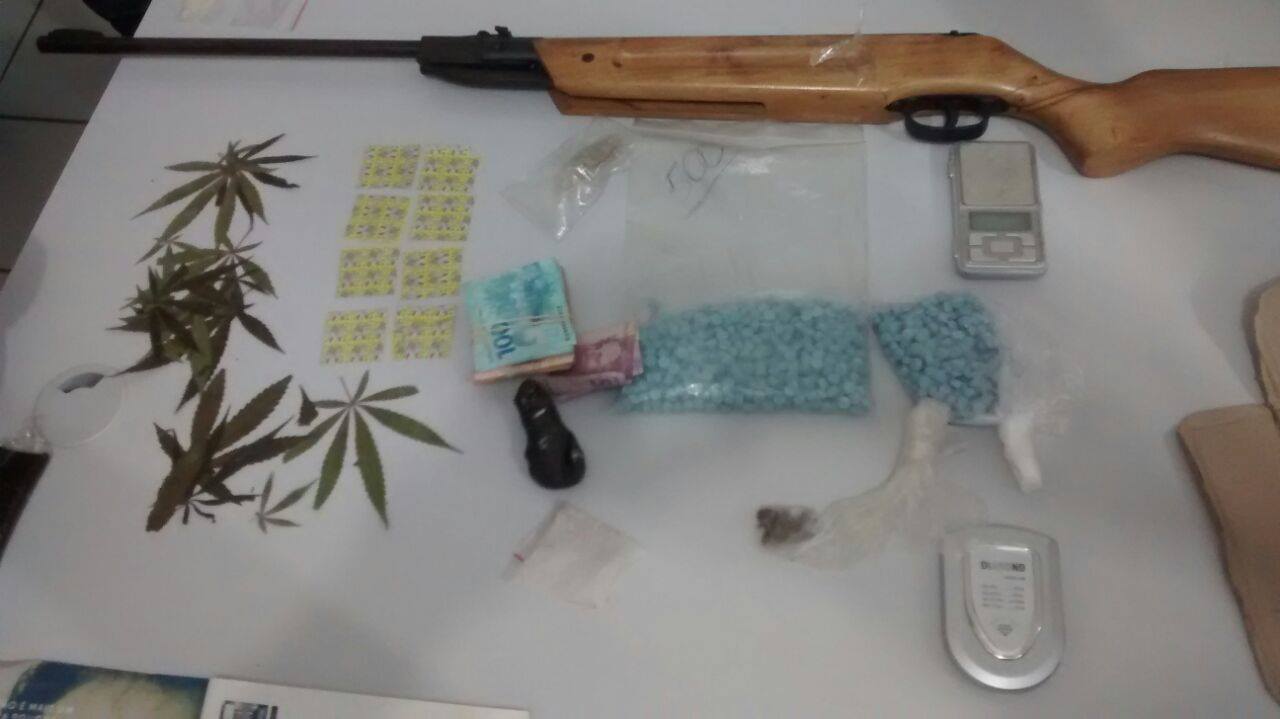 Foram apreendidos também: 2 balanças de precisão, 2 peças de haxixe, 2 porções de anfetamina, folhas de maconha, um frasco de alucinógeno em líquido e uma espingarda de pressão.