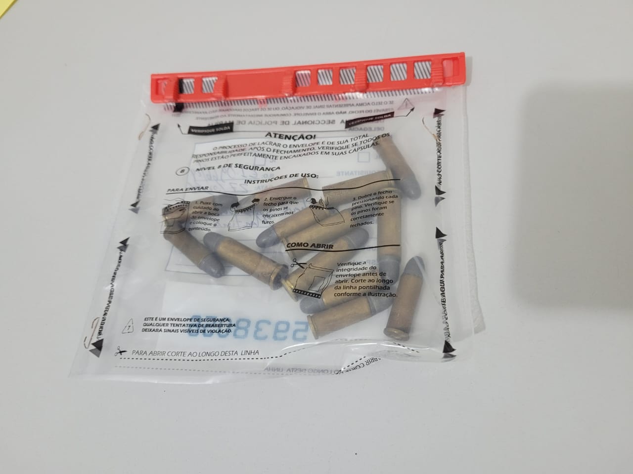 Sobre a arma, o acusado contou que fez o roubo com a arma falsa, mas que possuía algumas munições em casa. Foram apreendidos oito cartuchos calibre 32, quatro cartuchos calibre 38 e um estojo de calibre 38 vazio.
