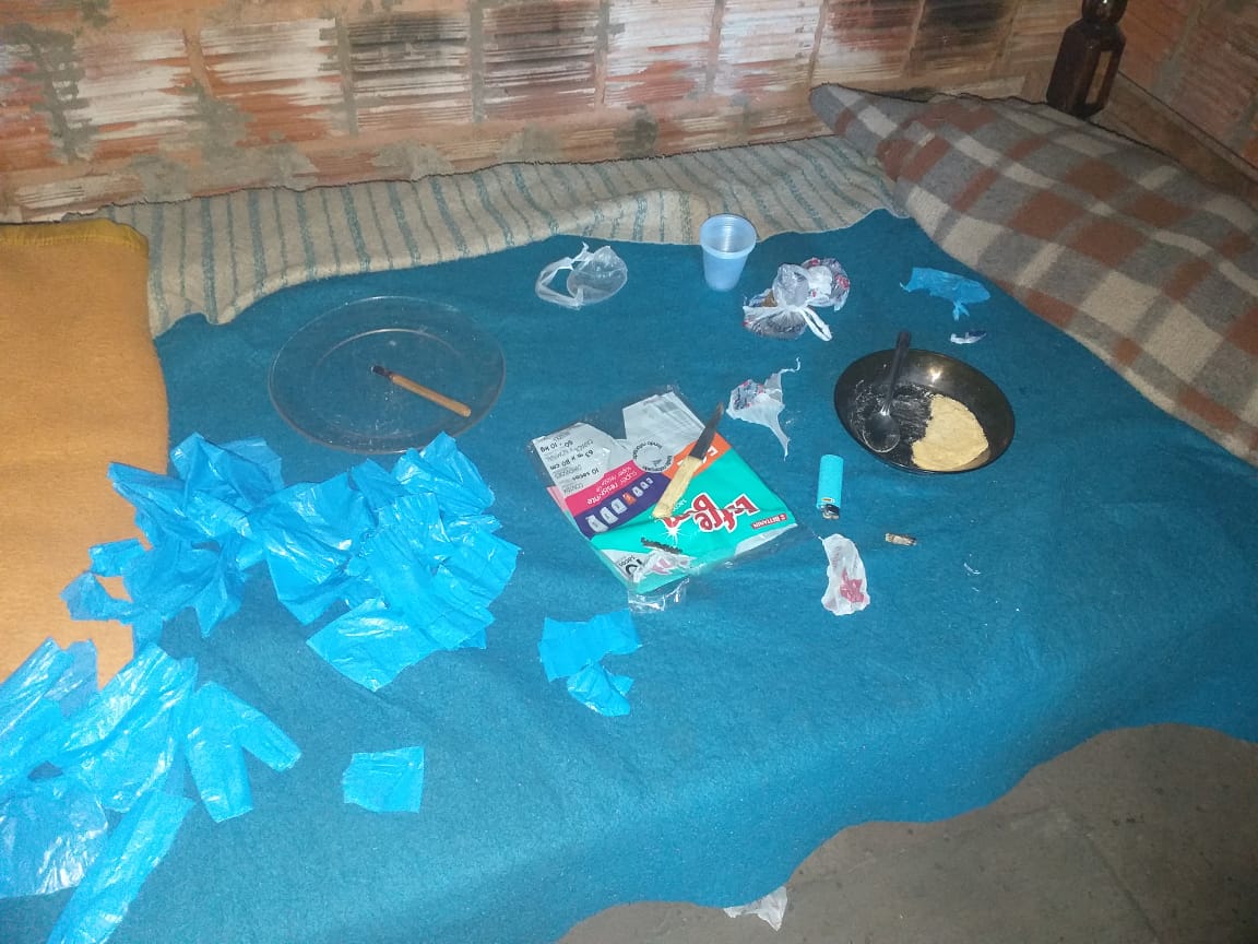 Com um dos garotos foram encontrados R$ 62. Em cima de uma mesa havia um prato com cocaína e apetrecho para embalar entorpecentes. Também foi encontrada uma grande porção de maconha sobre a cama.