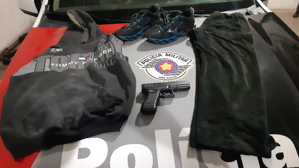 Diante dos fatos, foi realizada a revista em uma sacola que ele carregava. Dentro dela foram localizadas as vestes utilizadas na ação criminosa, juntamente com um simulacro de arma de fogo.