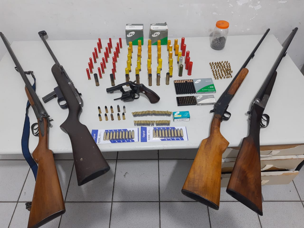 Ao notar a presença das viaturas o homem correu e fugiu para o interior de uma mata existente nos fundos, porém havia uma residência aberta no local e ao realizar uma varredura os militares encontraram cinco armas de fogo – quatro espingardas e um revólver calibre 38 – e várias munições.