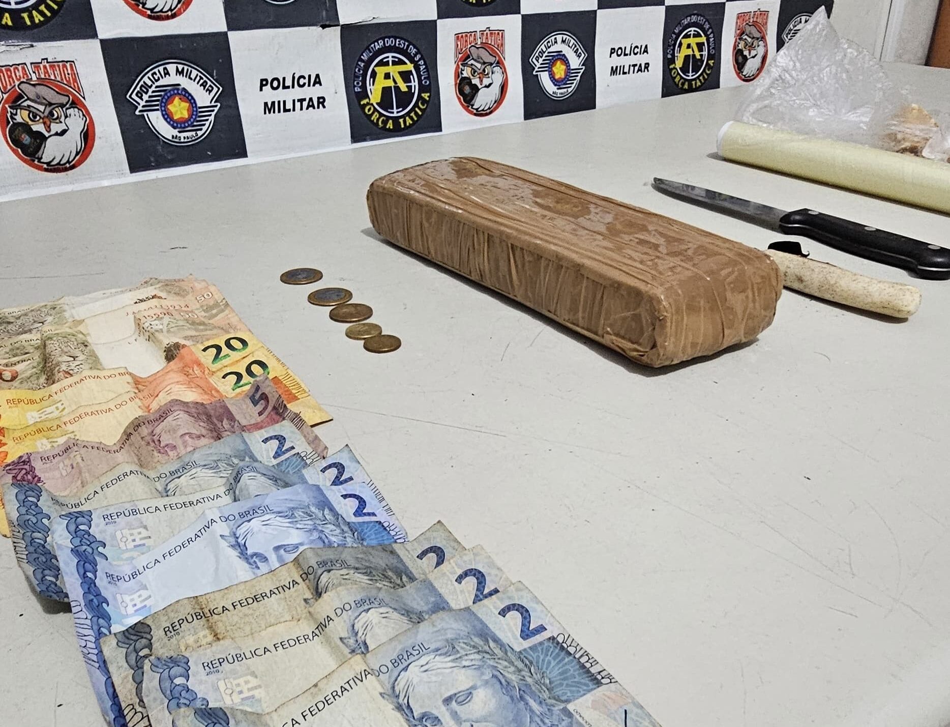 Encontraram também uma pedra de crack, dois celulares (um da marca Samsung e outro da Xiaomi), dois rolos de plástico filme, duas facas de cozinha, uma folha com anotações suspeitas e R$ 209,45 em trocados.