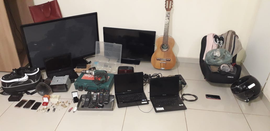 Após questionamento, houve mais uma confissão e os policiais encontraram diversos produtos de furto dentro de um automóvel Volkswagen Gol, como duas TVs, três notebooks e outros itens.