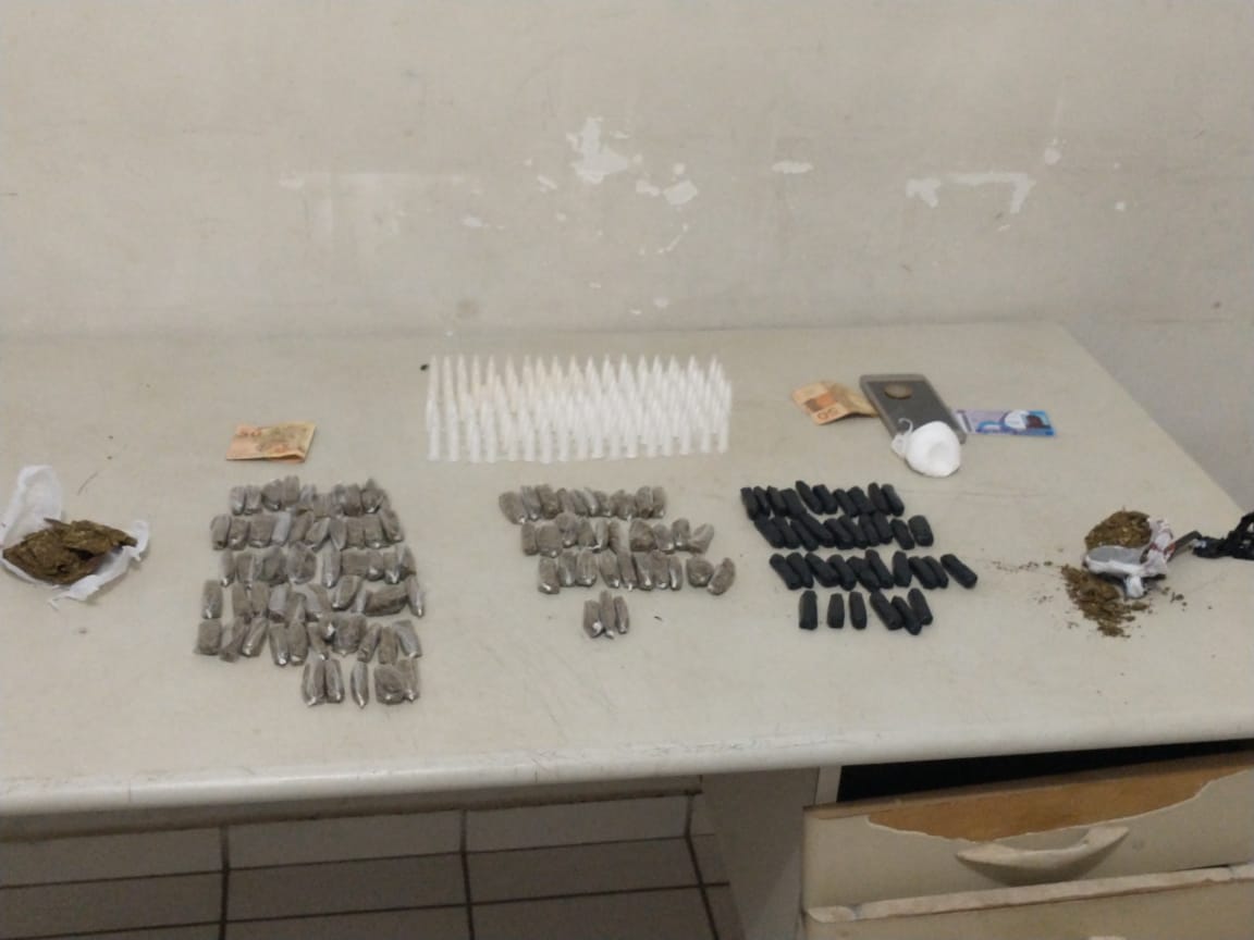 Ele foi identificado como Davi, a sacola foi recuperada, e nela havia uma porção fragmentada e mais 55 porções de maconha.