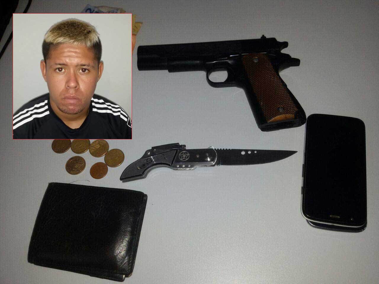 Viaturas fizeram patrulhas pela região e acabaram abordando os ladrões na pista de cooper, entre os pedestres, na altura da Associação dos Dentistas. Eles estavam na posse um simulacro de arma de fogo, canivete e o dinheiro.