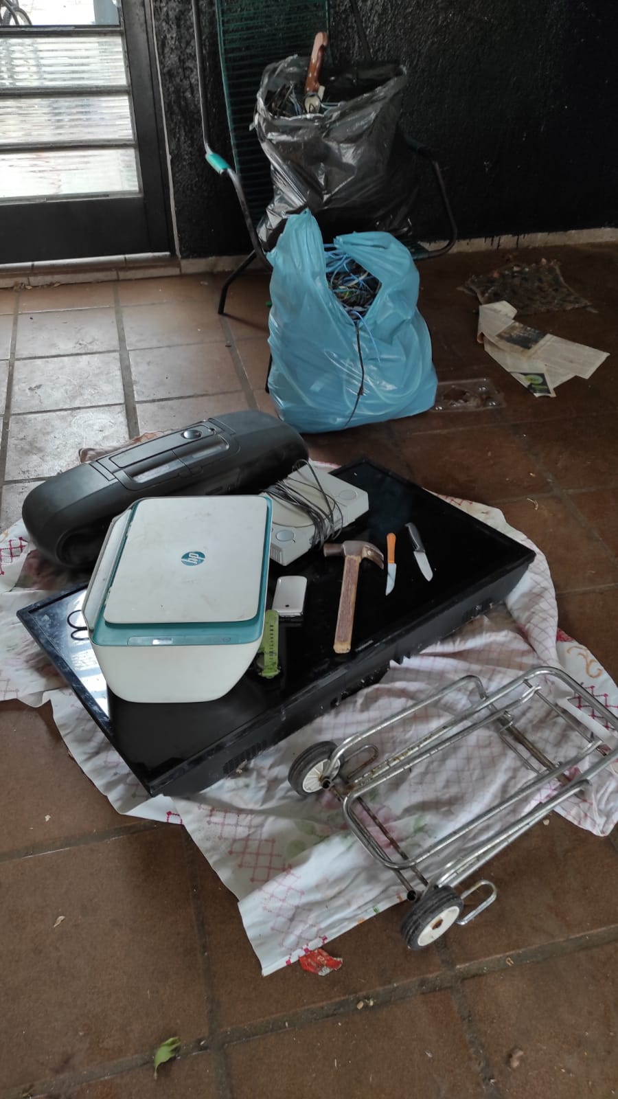 O imóvel passa por reformas e Luiz teria separado alguns objetos, entre impressora, TV, videogame, micro system, celular, relógio, três facas de cozinha, um martelo, dois sacos com fios elétricos e um carrinho de mão.