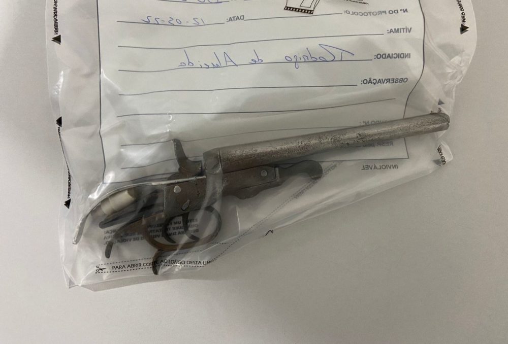 Ao perceber a presença da viatura, o suspeito tentou sair correndo, mas logo acabou abordado e detido. Ele foi identificado como Rodrigo e, na sacola, foi encontrada uma arma, tipo garrucha com dois canos, calibre 32 ou 38.