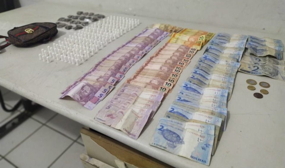 Com a aproximação da viatura, o rapaz demonstrou nervosismo e acabou abordado. Vinicius entregou uma bolsa aos policiais, que continha R$ 596,25, 19 porções de maconha e 162 pinos com cocaína.