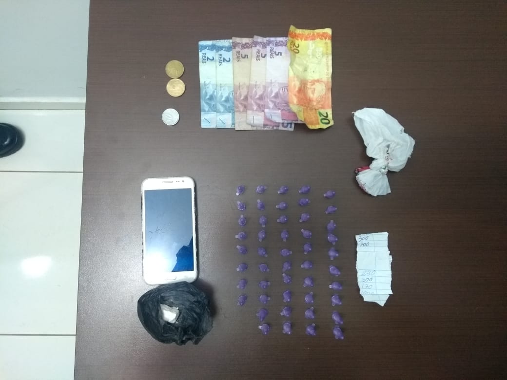 Em busca pessoal com Mortadela foram encontrados R$ 10 e uma pedra de cocaína. Já com seu comparsa havia um pino de cocaína e R$ 30. No veículo foram encontrados mais 47 pinos da droga.