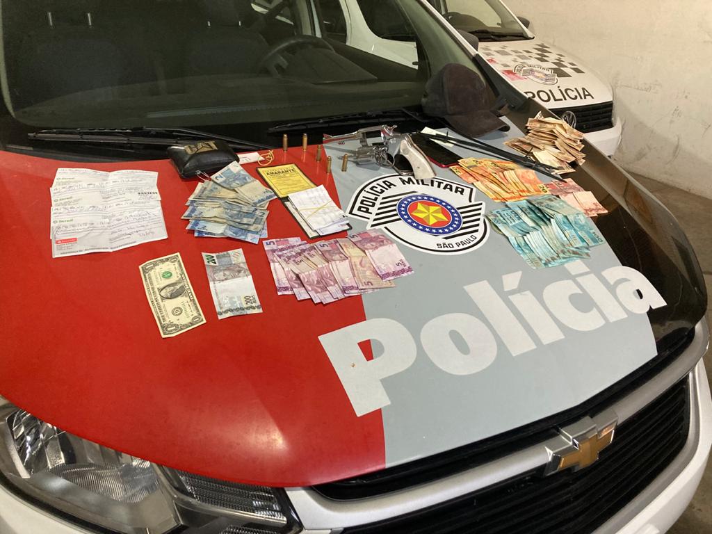 A Polícia Militar prendeu em flagrante três assaltantes na avenida Rio Branco, Centro de Marília, na tarde desta sexta-feira (30). Foram apreendidos um revólver calibre 38, com cinco munições, e cerca de R$ 13 mil, sendo R$ 4,2 mil em dinheiro e R$ 8,8 mil em cheques.
