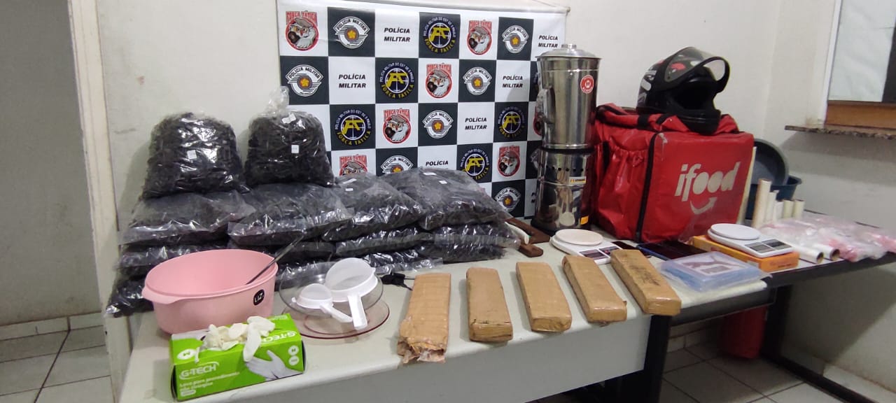 Com o trio, a polícia encontrou cerca de 4 kg de maconha, 1,1 kg de cocaína, 14 mil pinos plásticos vazios, balanças de precisão, guilhotina e outros objetos utilizados para o porcionamento das drogas.