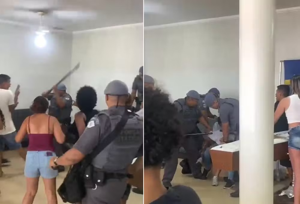 As imagens mostram o irmão de Guilherme sendo imobilizado enquanto a mãe, que estava ao lado do caixão, tenta protegê-lo. Pela resistência, ambos foram agredidos com cassetetes e empurrões.
